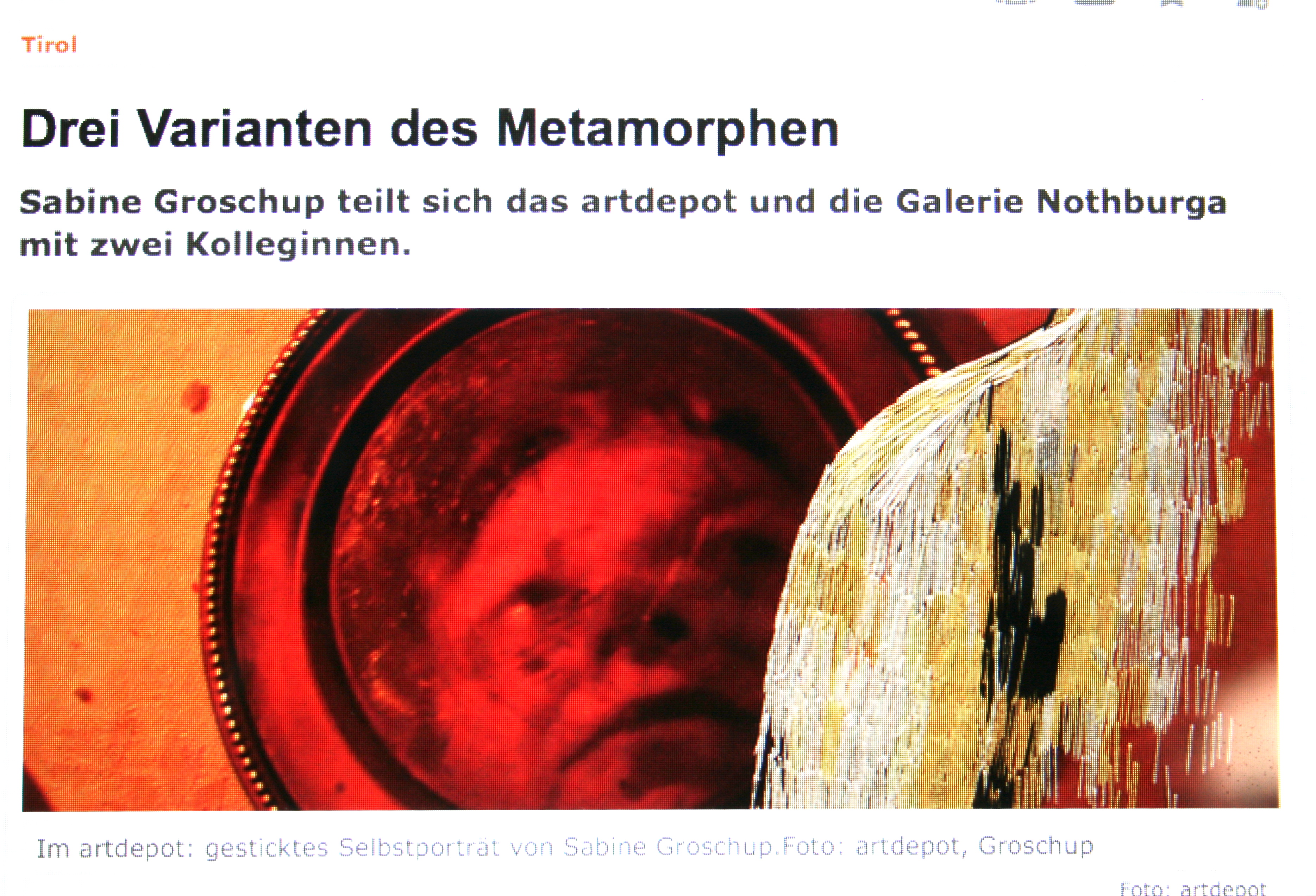 Ihre oft aus ungewöhnlichen Perspektiven fotografierten, bisweilen in Spiegelungen verschwimmenden Porträts sind auch die Basis von Bildern, die Groschup ins artdepot gehängt hat. In sie hat die Künstlerin mit gelben, weißen und schwarzen Fäden schemenhaft abstrahierte Figuren bzw. ein von ihr geschriebenes Gedicht gestickt. Da wie dort geht es letztlich um die Auseinandersetzung mit dem Tod, um die Präsenz von leiblich absenten, aber im Herzen weiterlebenden Menschen. Im artdepot zeigt außerdem Martina Tscherni in naturwissenschaftlicher Akribie daherkommende, maßstäblich aufgeblähte Zeichnungen fossiler Urformen. In der Nothburga ist dagegen Elisabeth Melkonyan die Partnerin Groschups, um in ihren Bildern und Objekten direkt auf diese Bezug zu nehmen, als Mensch wie als Künstlerin. (schlo)